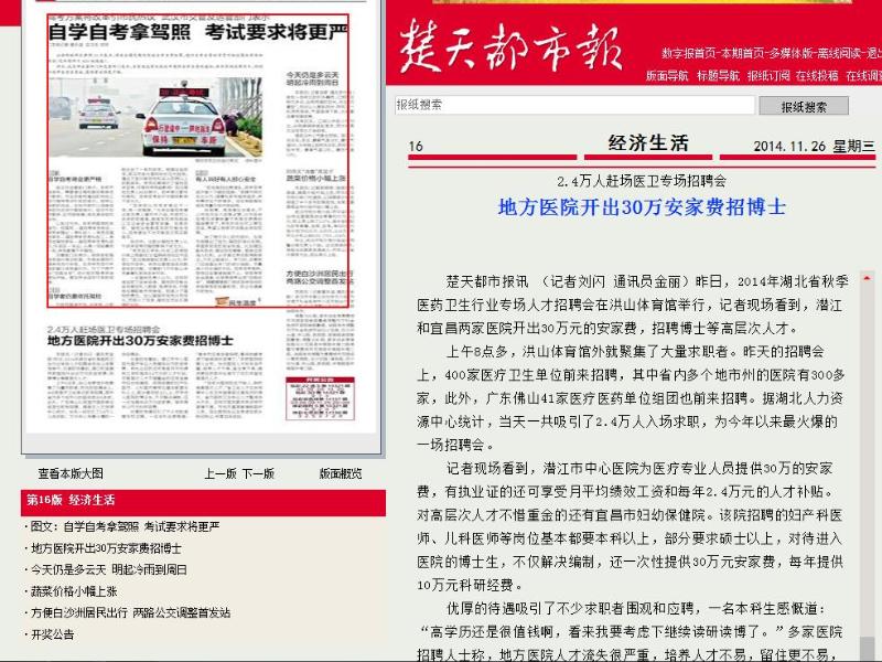 图2,2014年11月26日楚天都市报对25日的医药卫生行业专场人才招聘会上地方医院开出30万安家费招博士的报道