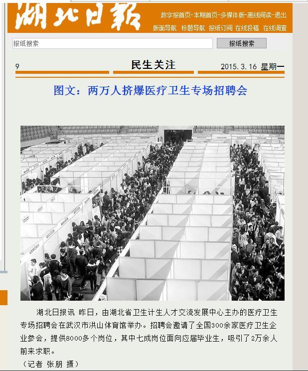 图3,2015年3月16日湖北日报对3月15日医疗卫生专场招聘会两万人挤爆医疗卫生专场招聘会的报道